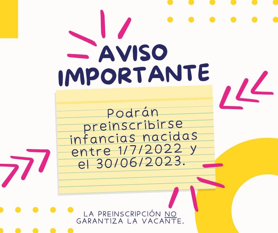 En esta etapa podrán inscribirse infancias nacidas entre el 1/07/2022 y el 30/06/2023. La modalidad de preinscripción será presencial y, en esta instancia, no es necesario presentar documentación impresa.