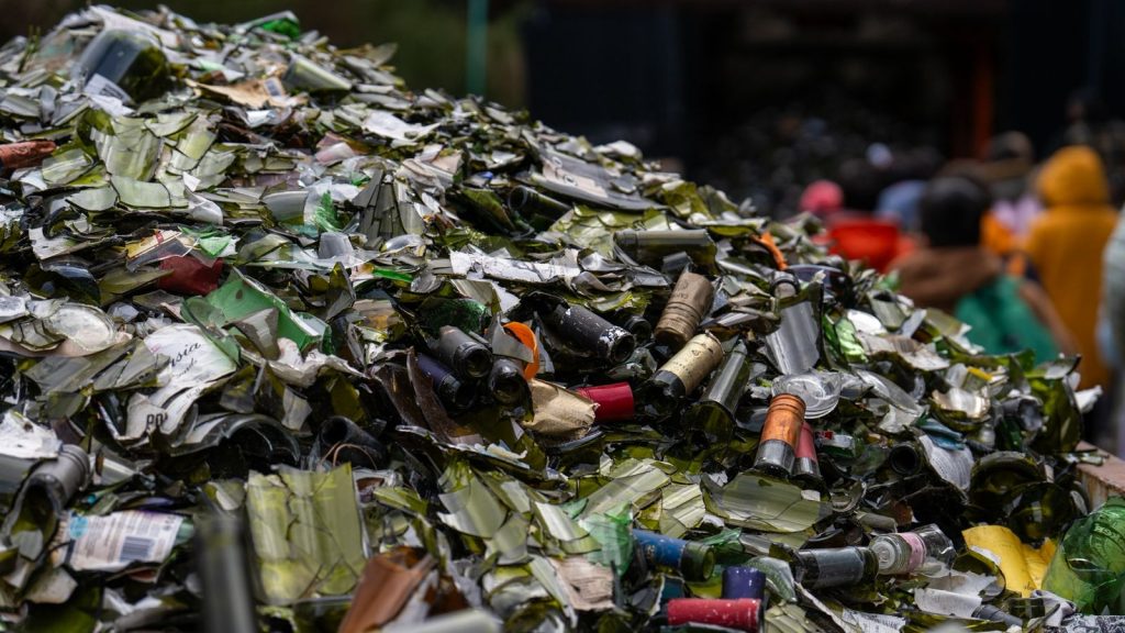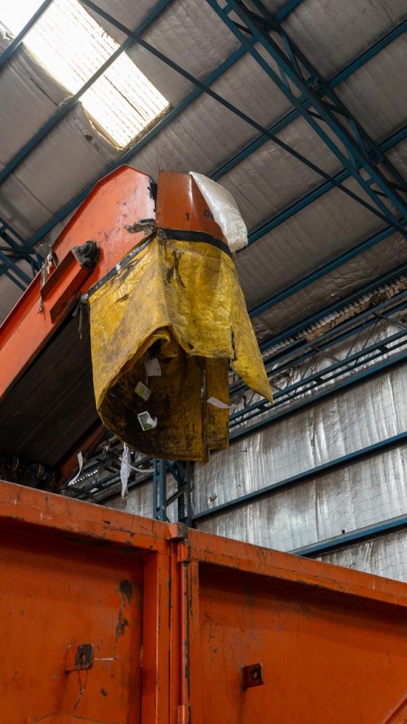 El grupo también visitó el sector de molienda de vidrios de botellas, que llega hasta allí en una cinta transportadora y, tras ser molido, se acumula en contenedores. El sector principal de la planta de SIRVE es el galpón de separación, donde una tolva que facilita el trabajo humano de clasificación de cada producto a reciclar.