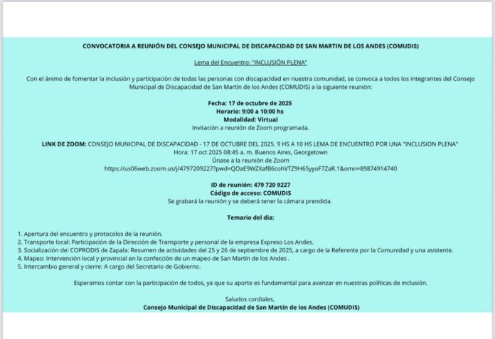 LINK DE ZOOM: CONSEJO MUNICIPAL DE DISCAPACIDAD – 17 DE OCTUBRE DEL 2025. 9 HS A 10 HS LEMA DE ENCUENTRO POR UNA «INCLUSION PLENA»