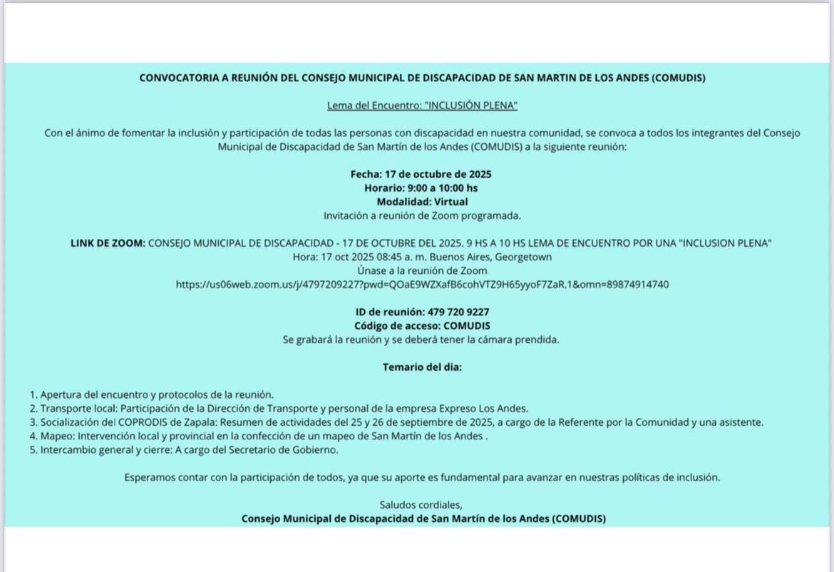 Con el ánimo de fomentar la inclusión y participación de todas las personas con discapacidad en nuestra comunidad, se convoca a todos los integrantes del Consejo Municipal de Discapacidad de San Martín de los Andes (COMUDIS) a la reunión que se realizará el próximo 17 de octubre, de 9.00 a 10.00 hs, con modalidad virtual.