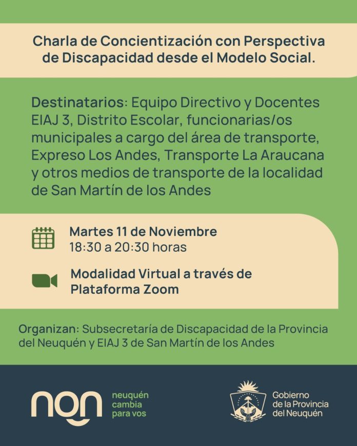 La Subsecretaría de Discapacidad de la provincia de Neuquén y la Escuela Integral de Adolescentes y Jóvenes con Discapacidad N° 3 de San Martín de los Andes organizan una charla de formato virtual para abordar de discapacidad desde el modelo social.