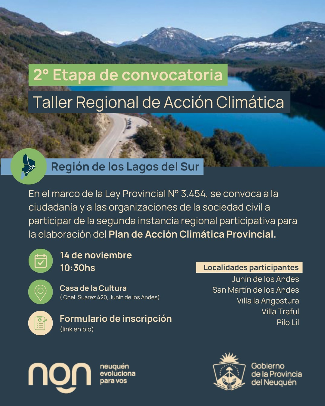 El próximo viernes, 14 de noviembre, se realizará el Segundo Taller Regional de Acción Climática de la Región Lagos del Sur, que se llevará a cabo a las 10.30 hs. en la Casa de la Cultura de Junín de los Andes, ubicada en Coronel Suarez 420.