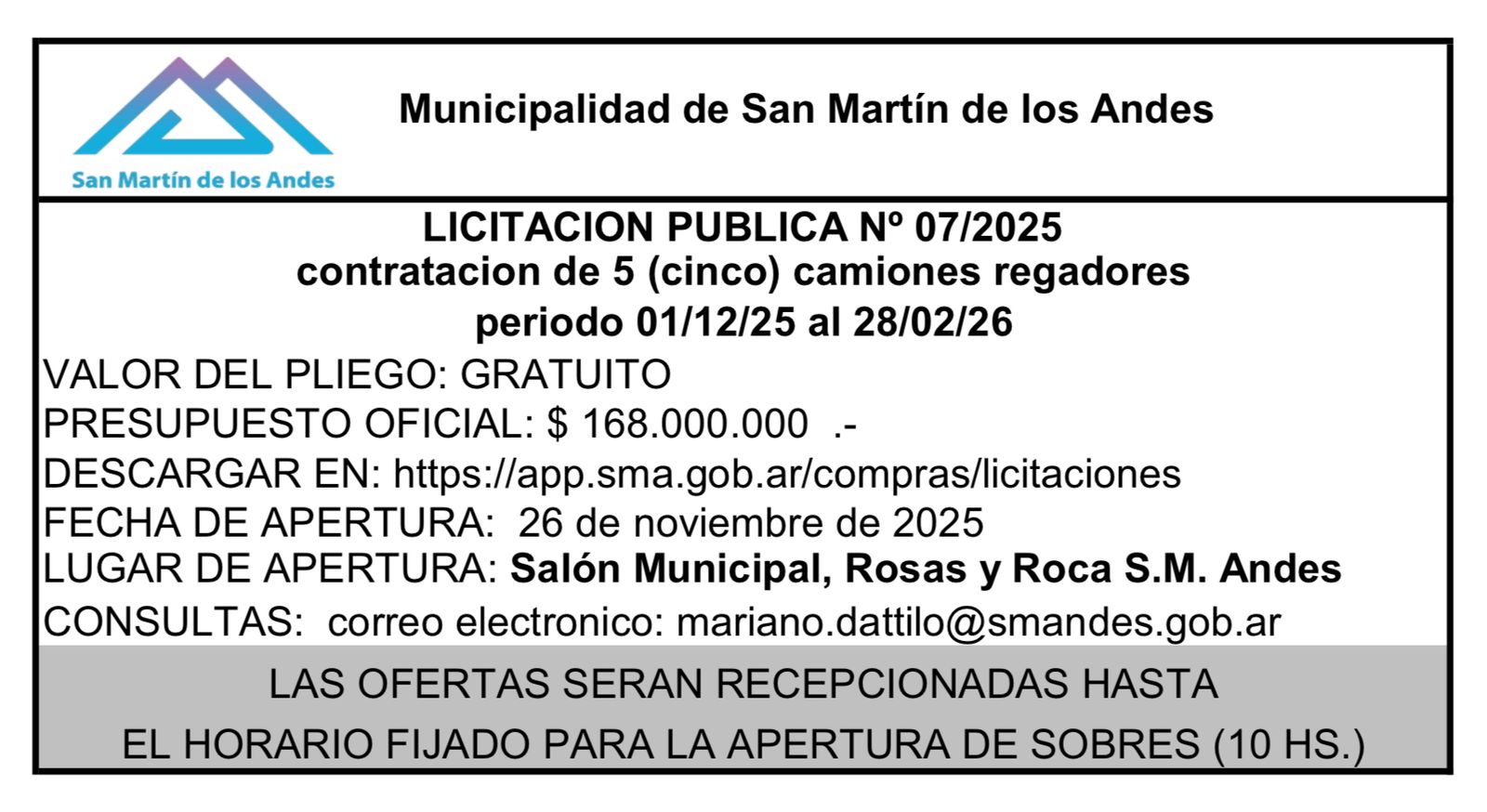 El Municipio llama a licitación para la contratación de 5 (cinco) camiones regadores durante el período que va del 1/12/25 al 28/02/26