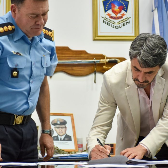 El intendente municipal, Carlos Saloniti, y el jefe de la Policía del Neuquén, comisario general Tomás Carlos Díaz Pérez, firmaron un convenio de trabajo conjunto que actualiza el marco legal operativo para atender los nuevos requerimientos de los vecinos y vecinas en áreas preventivas y de control.