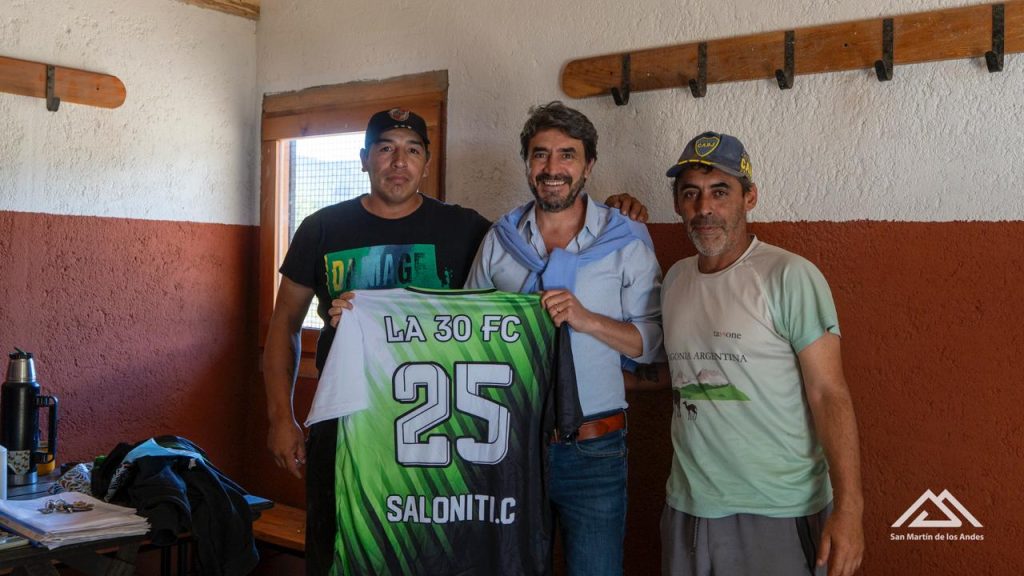 Durante la recorrida, Saloniti conversó con los dirigentes del fútbol barrial que están colaborando activamente para la concreción de la obra. El jefe comunal recibió de regalo una camiseta del club La 30 y conversó sobre los proyectos que la Liga tiene para ampliar la llegada del fútbol a los barrios y organizar torneos durante el verano.