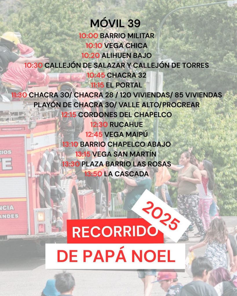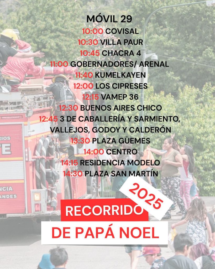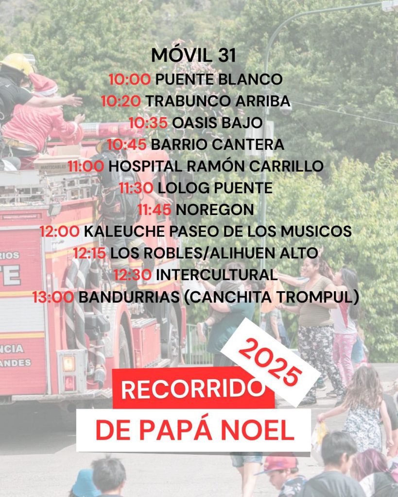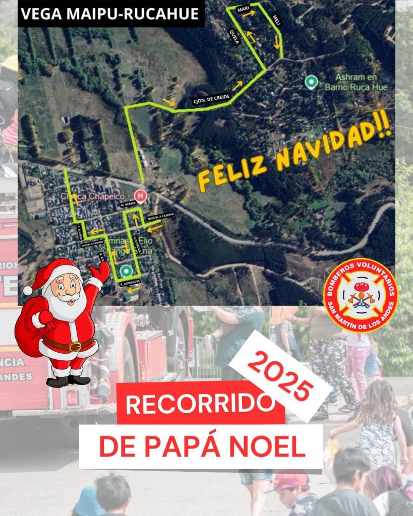 La Asociación de Bomberos Voluntarios de San Martín de los Andes informa a la comunidad que, como hace más de veinte años, se llevará adelante el tradicional recorrido navideño por los distintos barrios de la ciudad. La iniciativa tiene como objetivo compartir un momento de encuentro, cercanía y alegría junto a las familias y, especialmente, a los más chicos.