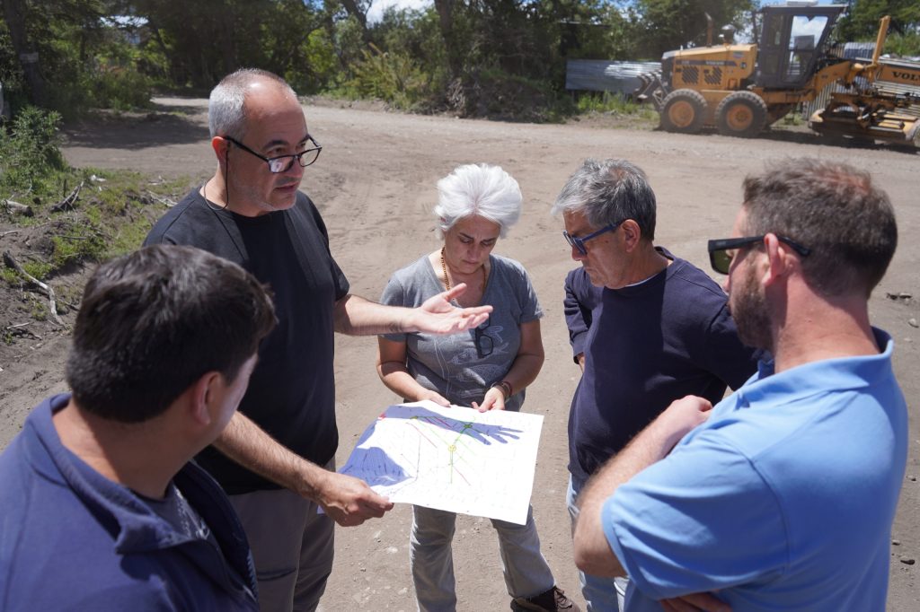 Padilla, González y los asesores técnicos de la Unidad Ejecutora y del Municipio, explicaron detalles del estado de obras en Kaleuche Alto en la actual etapa, denominada Etapa Cero, que se lleva adelante con fondos de un aporte de vecinas y vecinos.