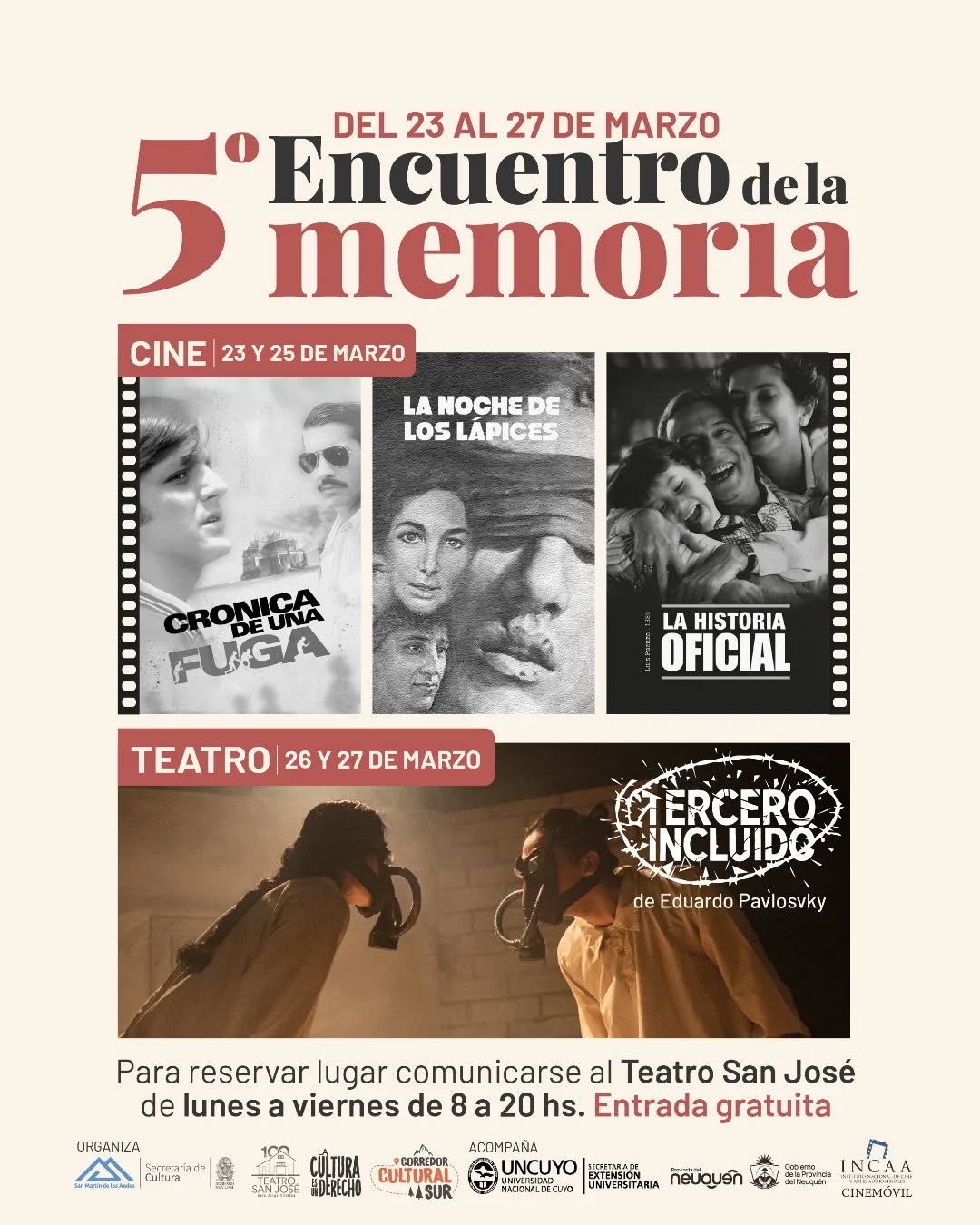 La propuesta incluirá funciones teatrales del prestigioso Elenco de Teatro de la Universidad Nacional de Cuyo, con la obra “Tercero Incluido”, de Eduardo Pavlosvky, y proyecciones de películas nacionales vinculadas a la época de la dictadura.