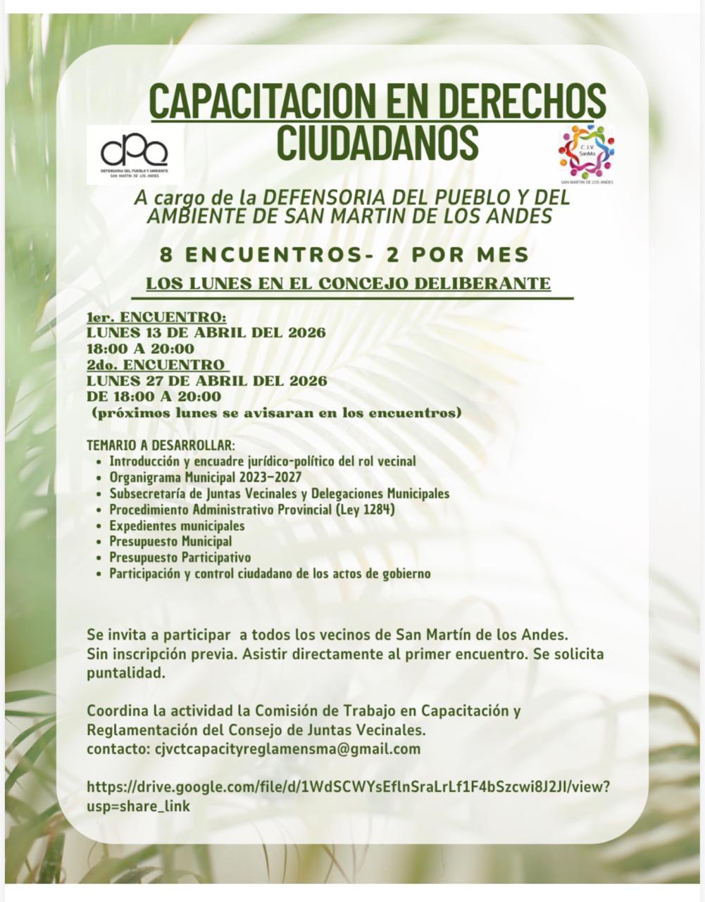 La Defensoría del Pueblo y del Ambiente y la Comisión de Trabajo en Capacitación y Reglamentación del Consejo de Juntas Vecinales, organizan una Capacitación de Derechos Ciudadanos, que estará a cargo de la Defensoría del Pueblo y del Ambiente.