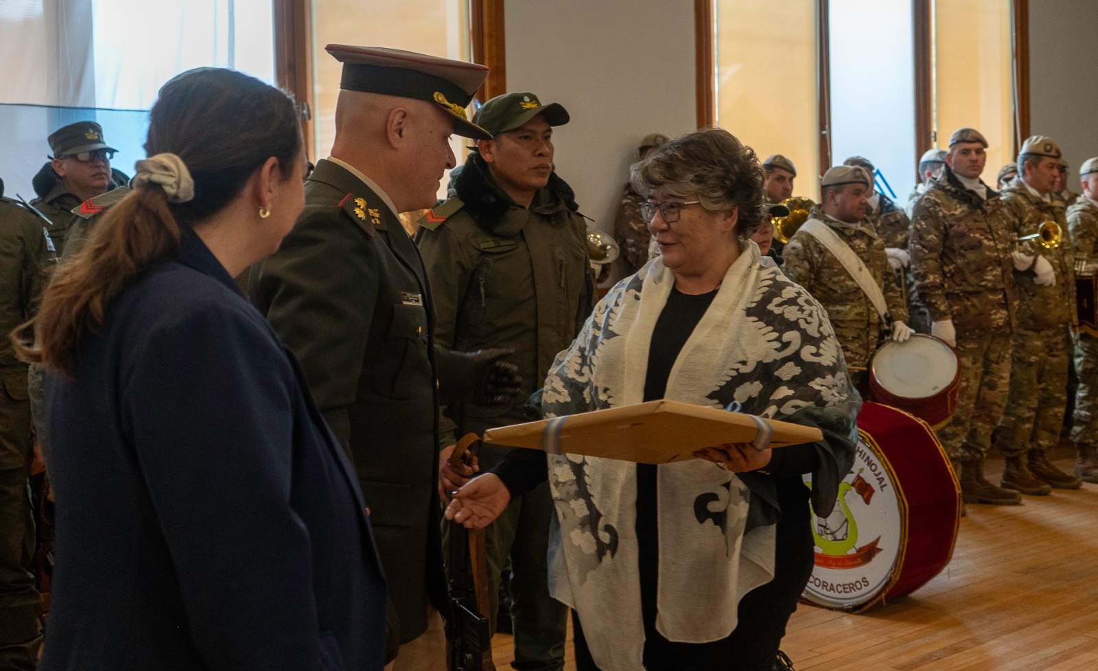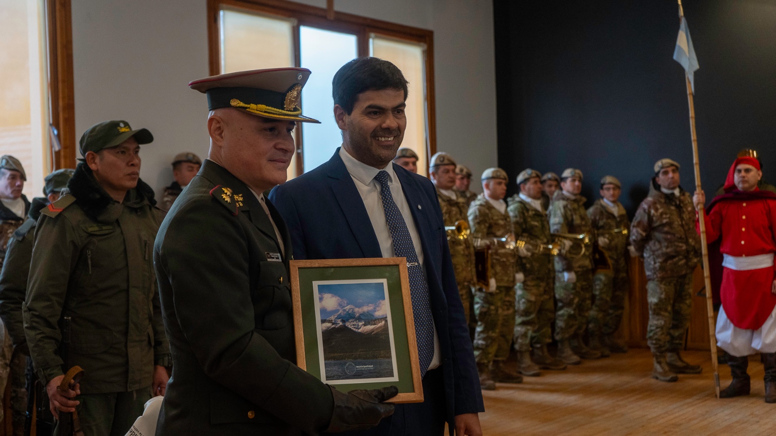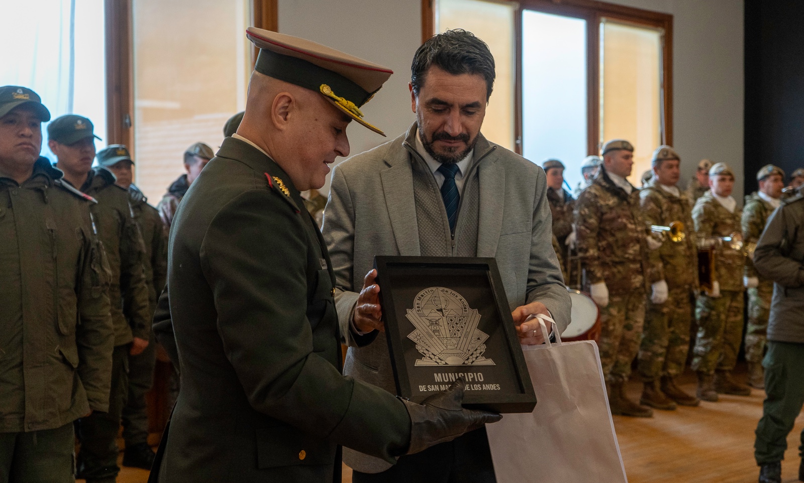 El jefe del Escuadrón 33 recibió en nombre de la institución obsequios de los Municipios de San Martín de los Andes y de Junín de los Andes, de los Concejos Deliberantes de ambas ciudades y de las fuerzas de seguridad.