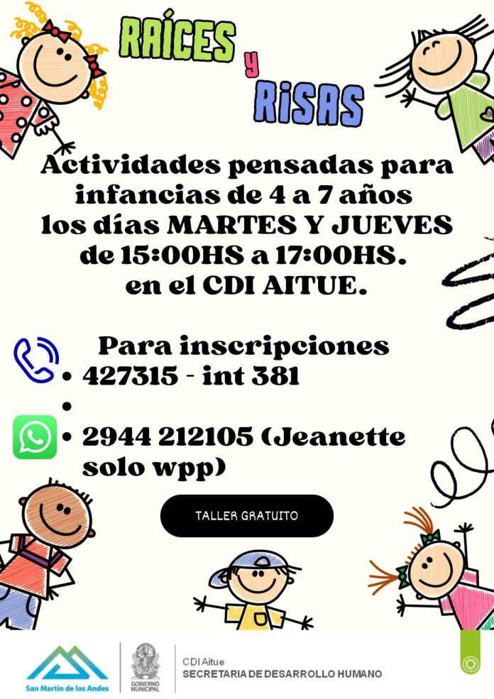 La Secretaría de Desarrollo Humano de la Municipalidad de San Martín de los Andes invita a la comunidad a participar del taller “Raíces y Risas”, una propuesta destinada a niños y niñas de entre 4 y 7 años, pensada para compartir experiencias, aprender y divertirse en un entorno cuidado.