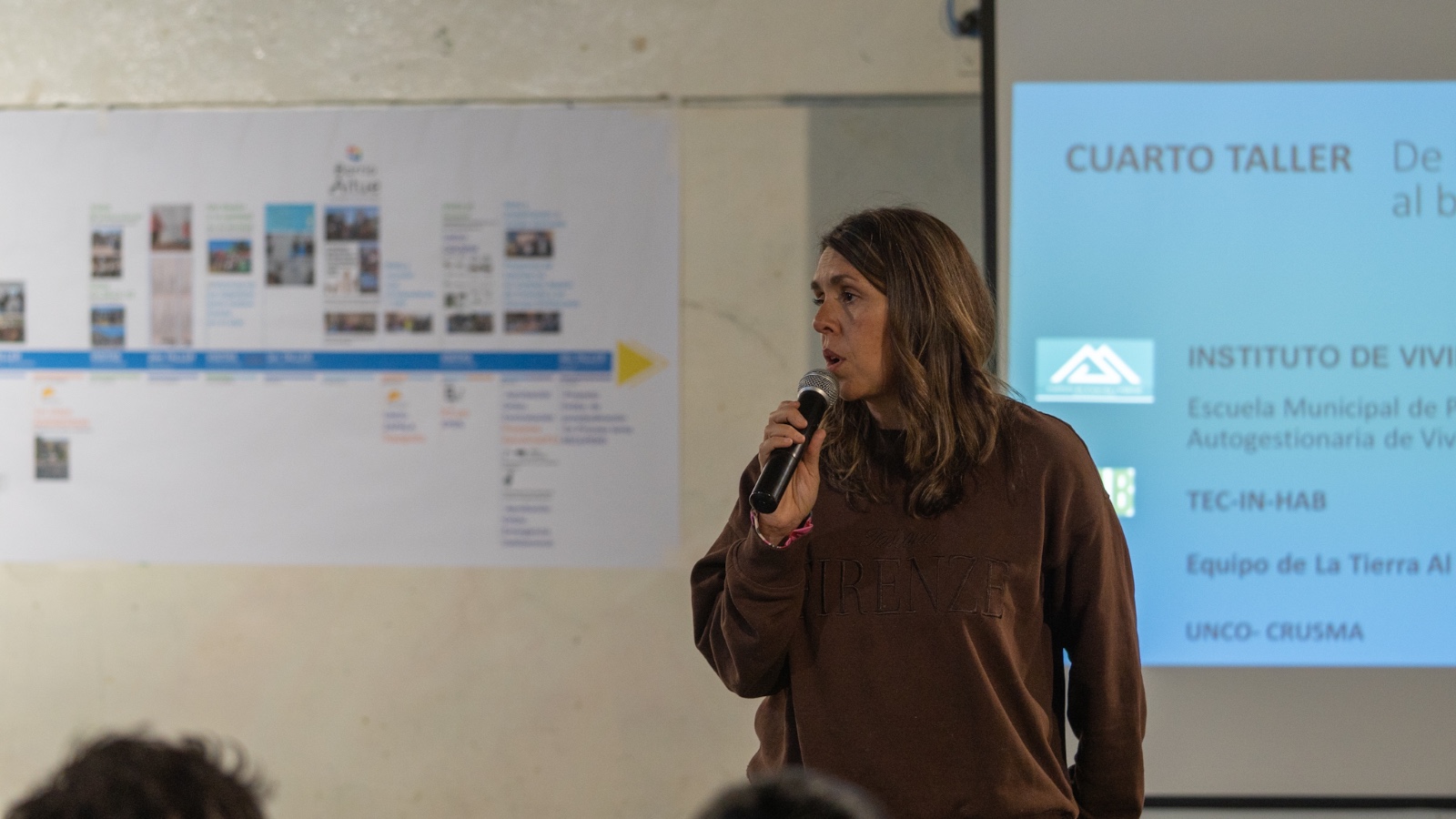 Verónica Carbone del Centro Regional de la UNCo dio detalles del desarrollo de tres proyectos de extensión que contribuirán a enriquecer la propuesta de urbanización, considerando las condiciones del paisaje y el análisis eco social de las posibles formas de urbanización con sostenibilidad.