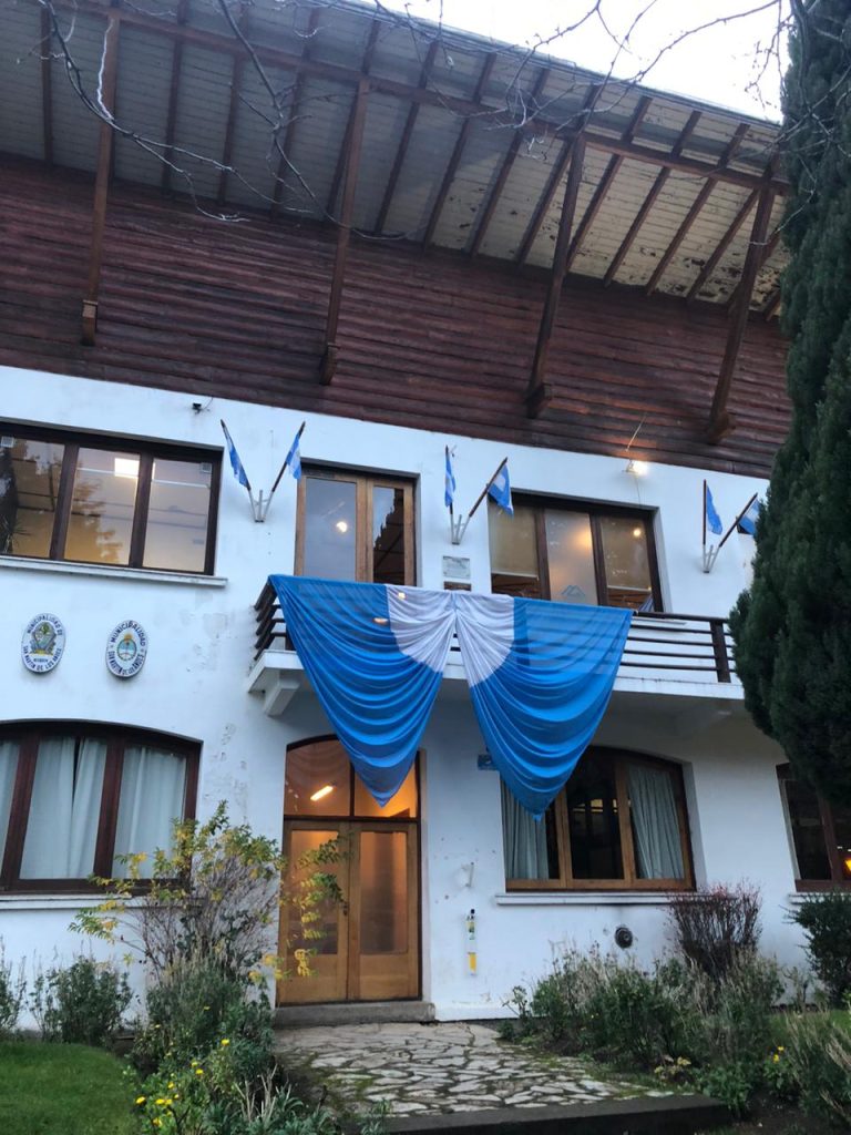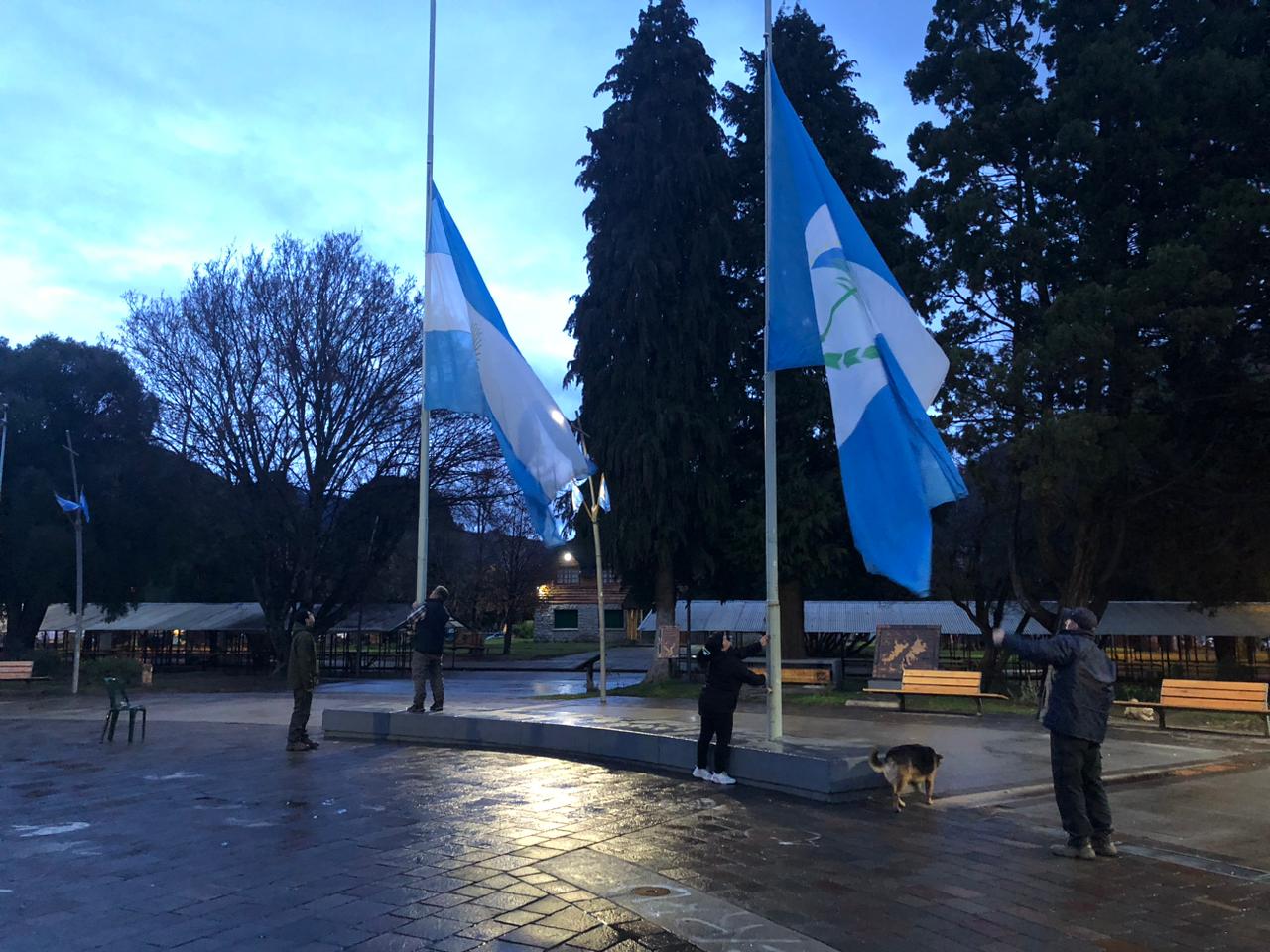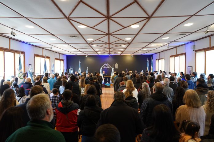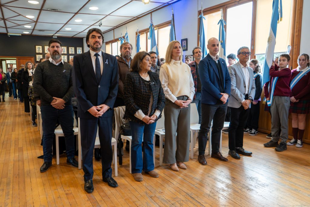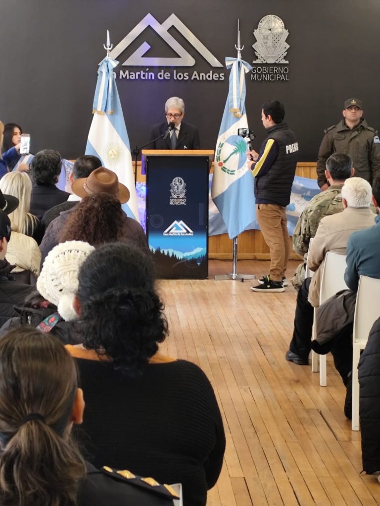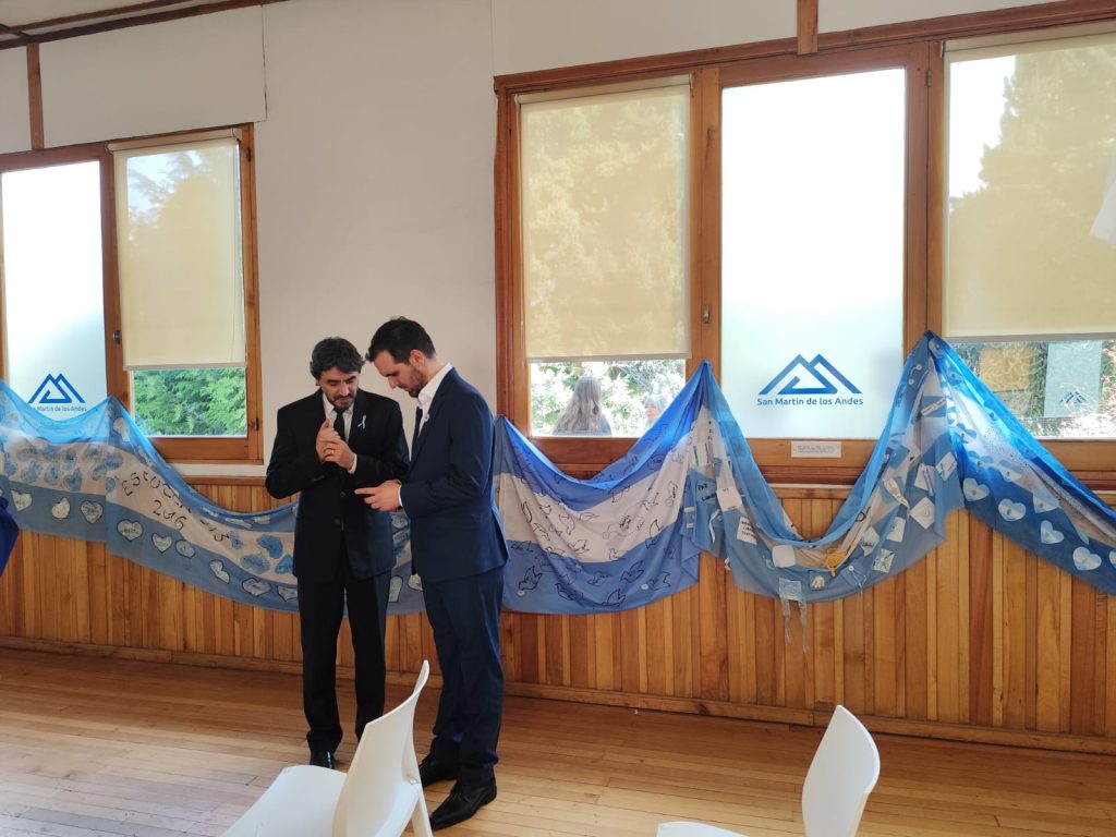 El acto incluyó la presentación de una bandera de 85 metros, desplegada sobre los laterales del Salón Municipal, resultado de un proyecto llevado a cabo por el Municipio y las escuelas de San Martín de los Andes, mediante el cual, cada establecimiento agregaría un tramo de tela de 3 metros.
