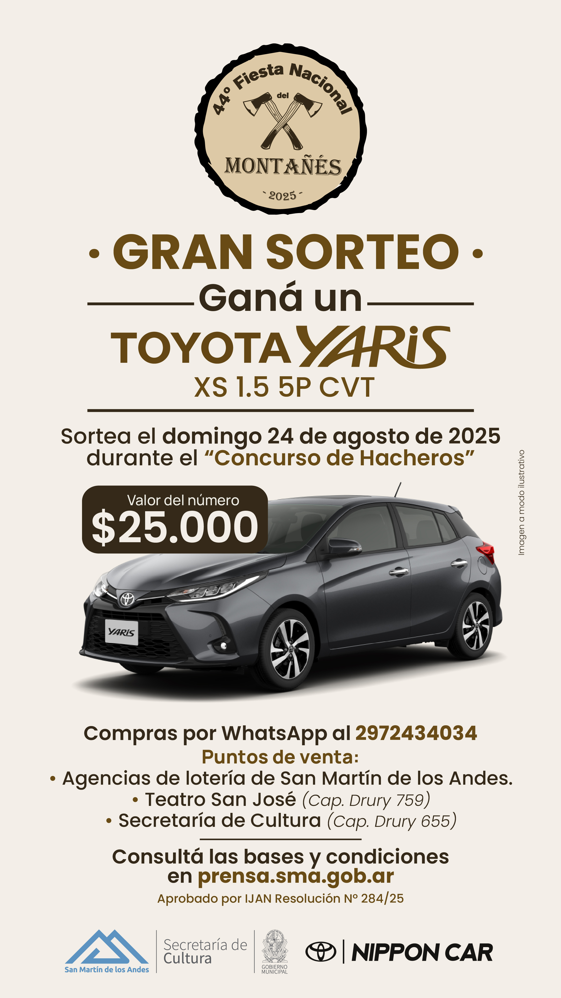 Ya está en marcha el Gran Sorteo de la 44ª Fiesta Nacional del Montañés. Comprando tu número podés ganar un Toyota Yaris XS 1.5 5P CVT. El sorteo se realizará el domingo 24 de agosto de 2025 durante el Concurso de Hacheros.