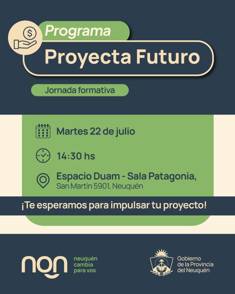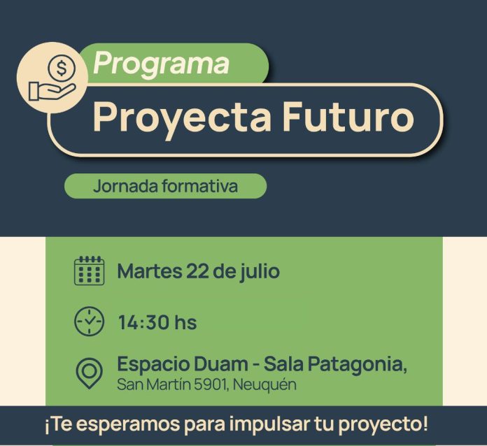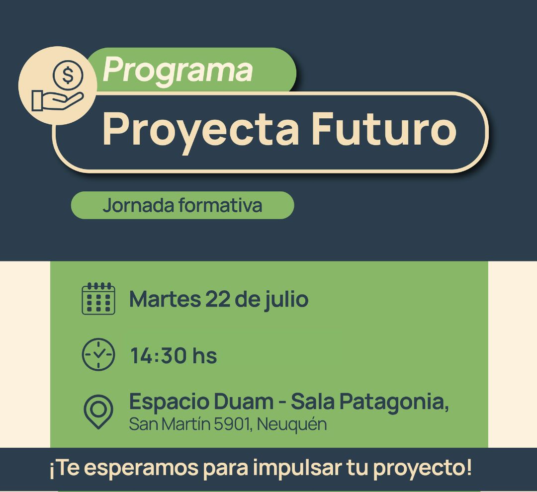 El próximo martes 22 de julio, a las 14.30, se realizará en el espacio DUAM, de la ciudad de Neuquén, el Primer Encuentro del Programa Proyecta Futuro, un espacio que busca promover el mejoramiento de emprendimientos con financiamientos de hasta 30 millones de pesos.