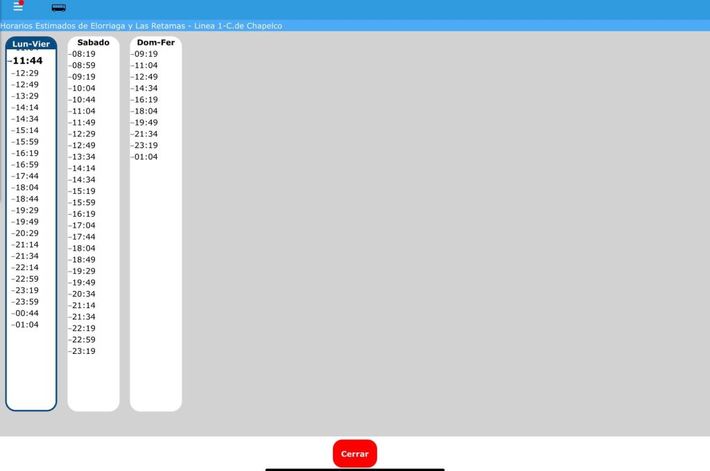 Finalmente, con click en la parada seleccionada, se abre una ventanita con el horario de la próxima llegada, el tiempo estimado para la pasada de la unidad por ese sitio. Al pie de esta ventana, figuran los horarios diagramados, para realizar consultas de otros servicios.