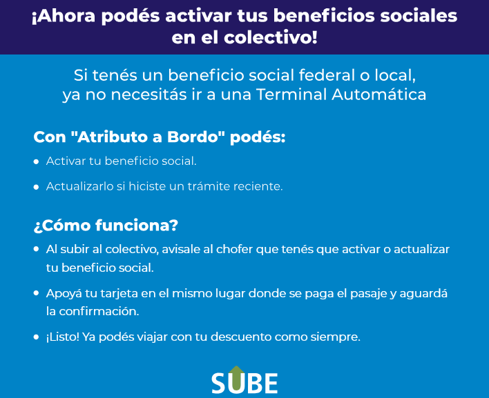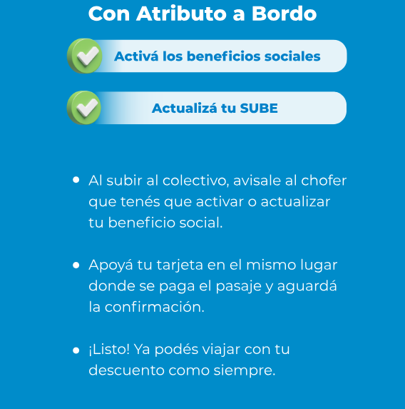 1. Al subir al colectivo, informar al chofer que hay que activar un beneficio social, actualizar los atributos en la SUBE o finalizar el trámite de registro de la tarjeta física.