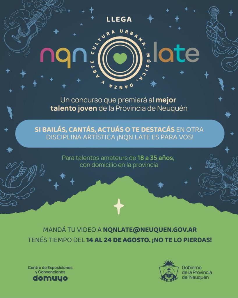 El Ministerio de Desarrollo Humano, Gobiernos Locales y Mujeres de la Provincia del Neuquén invita a toda la comunidad a participar y disfrutar del lanzamiento de “NQN Late”, un innovador concurso de talentos amateur dirigido a jóvenes de 18 a 35 años de las siete regiones de la provincia.
