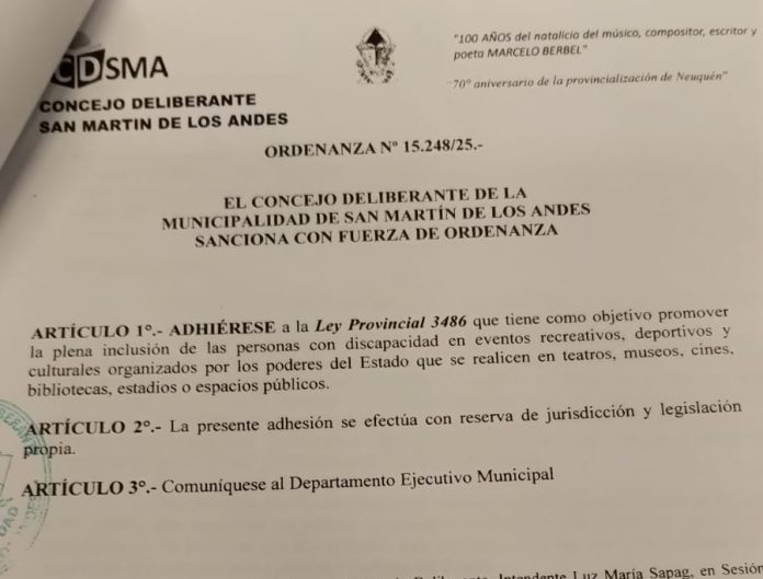 Por Ordenanza aprobada en la última sesión del Concejo Deliberante, el Municipio de San Martín de los Andes adhirió a la Ley provincial N°3486, que “tiene como objetivo promover la plena inclusión de las personas con discapacidad en eventos recreativos, deportivos y/o culturales organizados por los poderes del Estado que se realicen en teatros, museos, cines, bibliotecas, estadios y/o espacios públicos”.