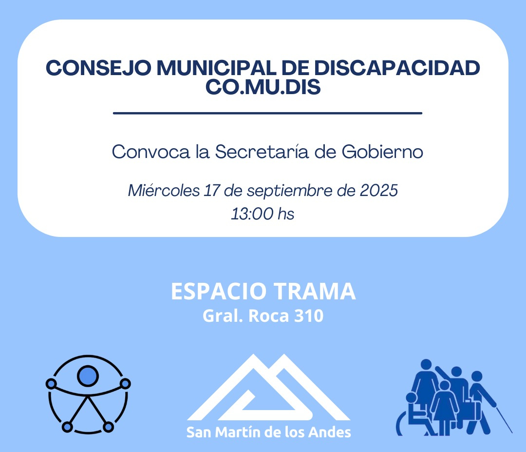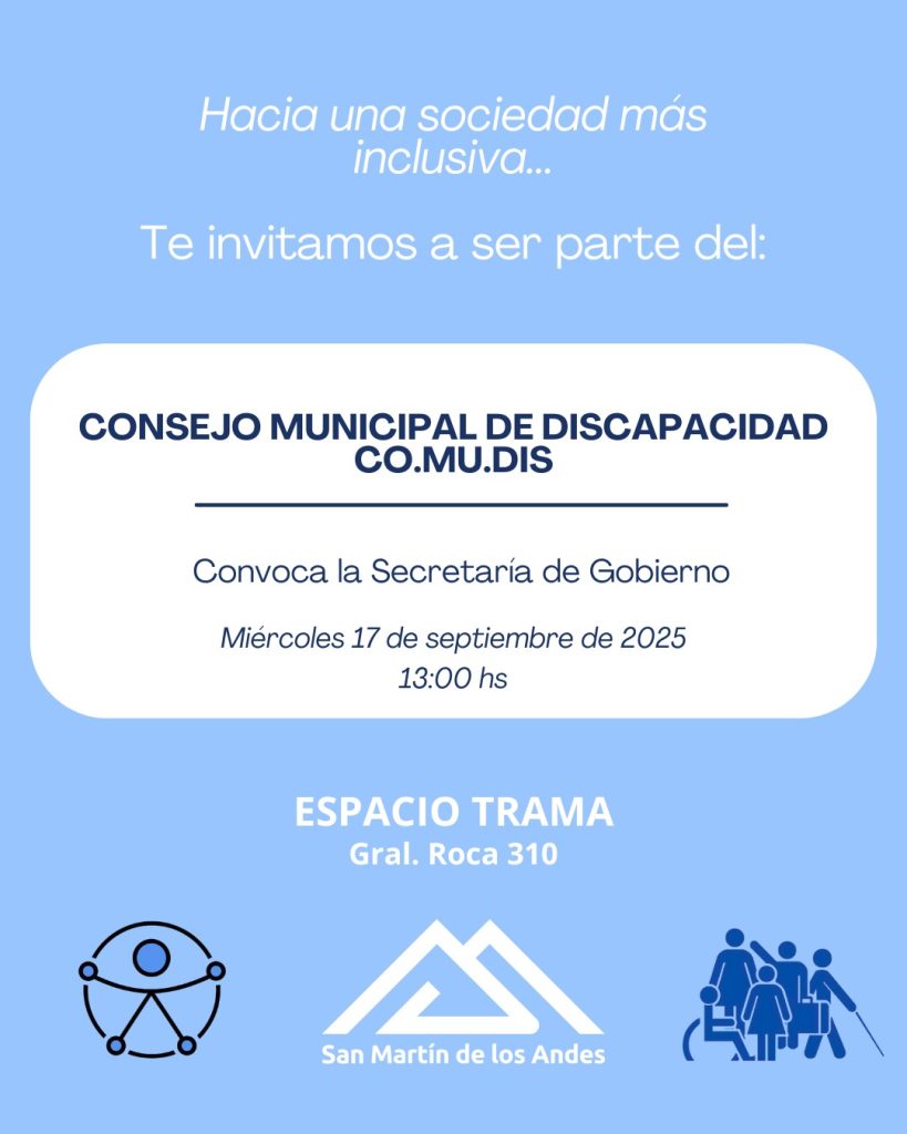La Secretaría de Gobierno del Municipio invita a la comunidad a una jornada donde se brindará información actualizada sobre políticas y acciones sobre discapacidad en San Martín de los Andes, con la presencia de panelistas convocados para esta temática por el Consejo Municipal de Discapacidad, Co.Mu.Dis.